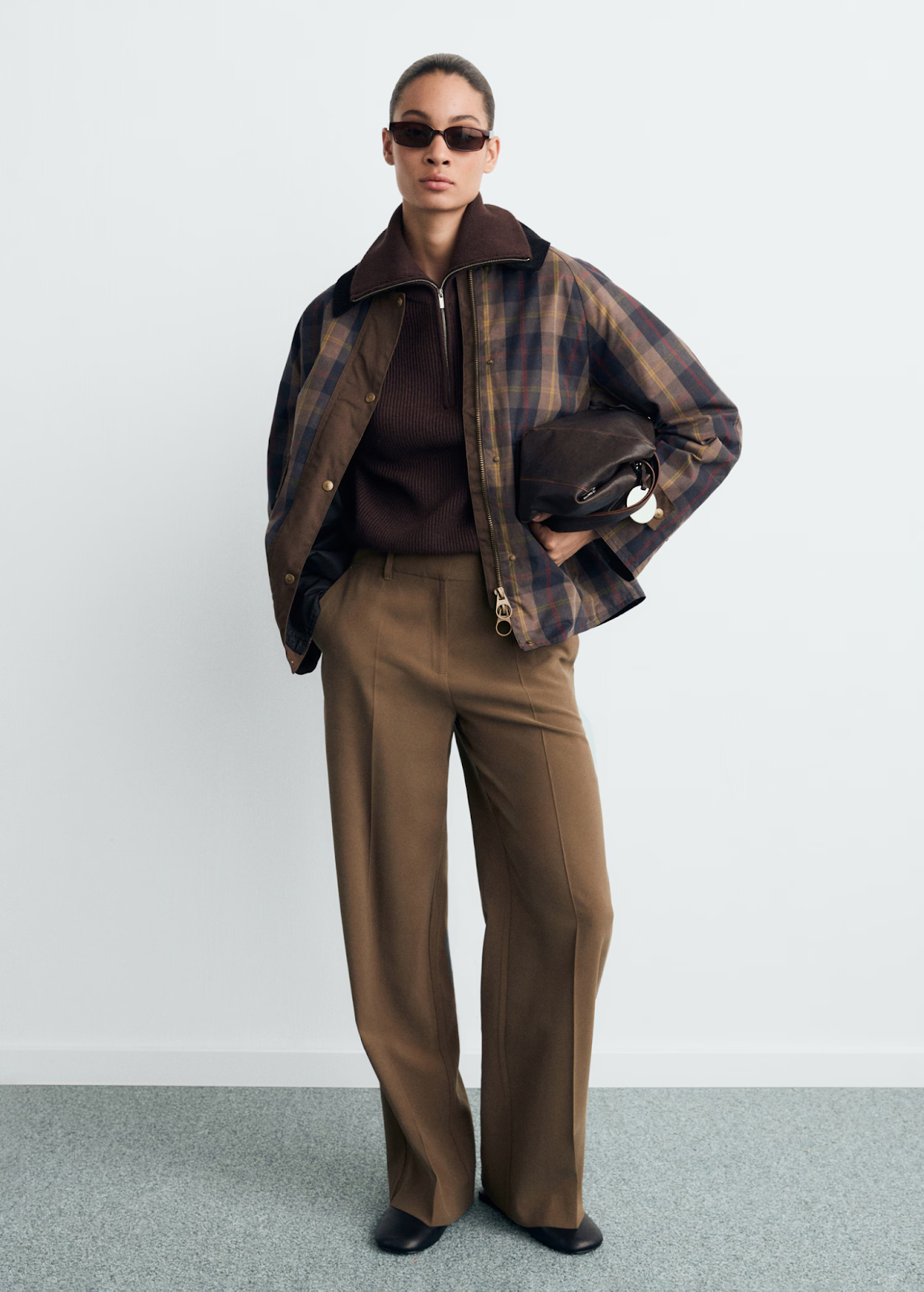 Notre conseil : associez un pantalon large camel avec un pull sombre en maille, ajoutez une veste à carreaux oversize et terminez par un sac en cuir minimaliste. Vous obtenez un look travaillé, moderne et parfaitement dans l’air du temps.
